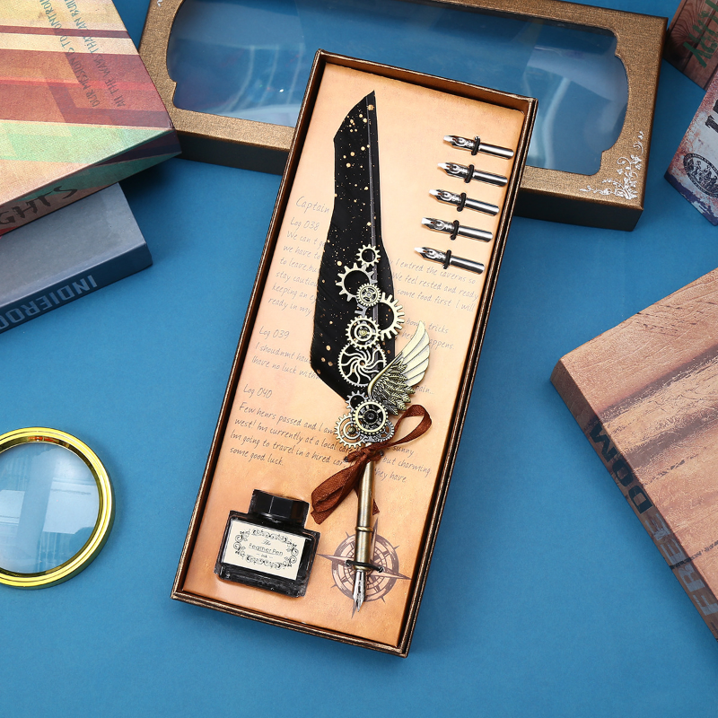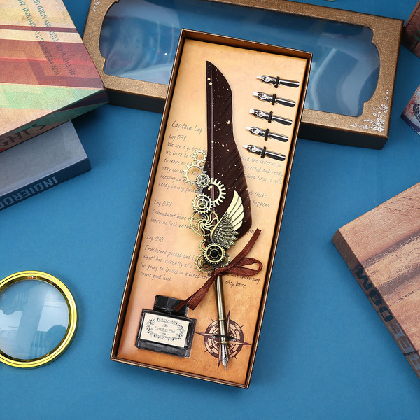 Bring a touch of magic to your writing desk with this Harry Potter Inspired Quill Feather Pen Set. Designed in a classic vintage style, this elegant feather dip pen set creates a unique and old-world writing experience.