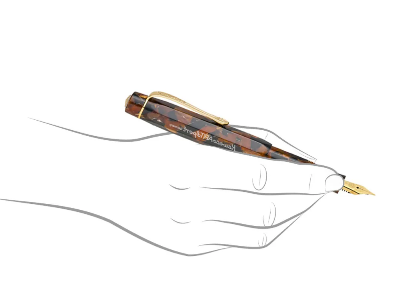 Kaweco's Art Sport Fountain Pen in Hickory Brown oozes elegance. This high-quality acrylic writing instrument combines a rich black tone with sparkling brown inlays to create an eye-catching, noble collector's item. Its highly polished surface and the different intensities of brown tone create an intriguing tension and depth effect. As a result of the oversized cap arrangement, the pen is small when closed, but full-length when open. Incorporating a gold pocket clip to complement the pen's aesthetic.