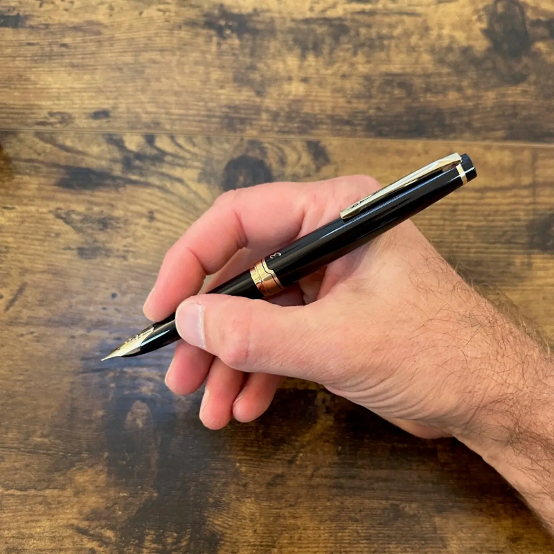 The Pilot E95s is a nod to the great design of a previous era with the elegant, stream-lined look of a classic 1960's fountain pen. Enjoy the beauty of a vintage styled fountain pen with a slim, lightweight black body and gold trim. A unique feature of this pen is the inlaid 14k gold nib for exquisitely smooth writing. It comes with a Pilot CON-40 converter, and also accepts proprietary Pilot ink cartridges. It is packaged in an elegant Pilot gift box.