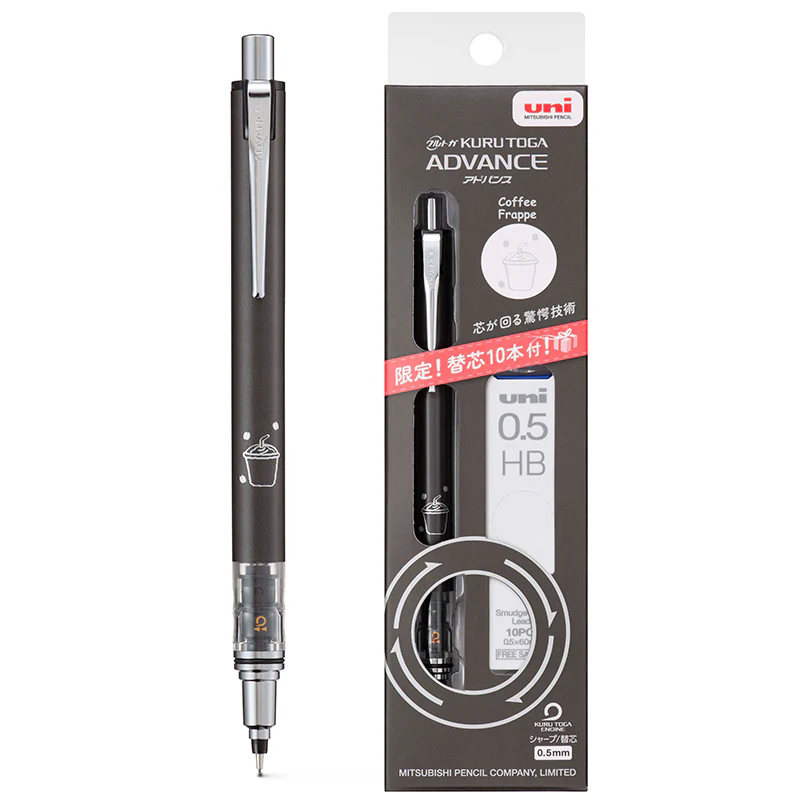 Uni Kuru Toga Advance - Auto Lead Rotating Mechanical Pencil, 0.5mm Limited with Leads M5-559 The Kuru Toga Advance has a core rotation mechanism that continually rotates the pencil lead as you write. A spring-loaded clutch twists the lead incrementally every time you lift the pencil from the paper, allowing a uniform wearing of the lead so that it always remains pointed. The new W-Speed engine turns lead twice as fast as the original uni Kuru Toga for continuous sharpening. Every 10 strokes, the lead turns thereby always keeping the tip sharp and precise. The metal pipe at the tip keeps the lead from breaking and retracts as you write ensuring the perfect amount of lead is always exposed. The Nano Dia lead is infused with millions of nanodiamond particles and silicone oil, resulting in a strong lead that produces darker and smoother lines.